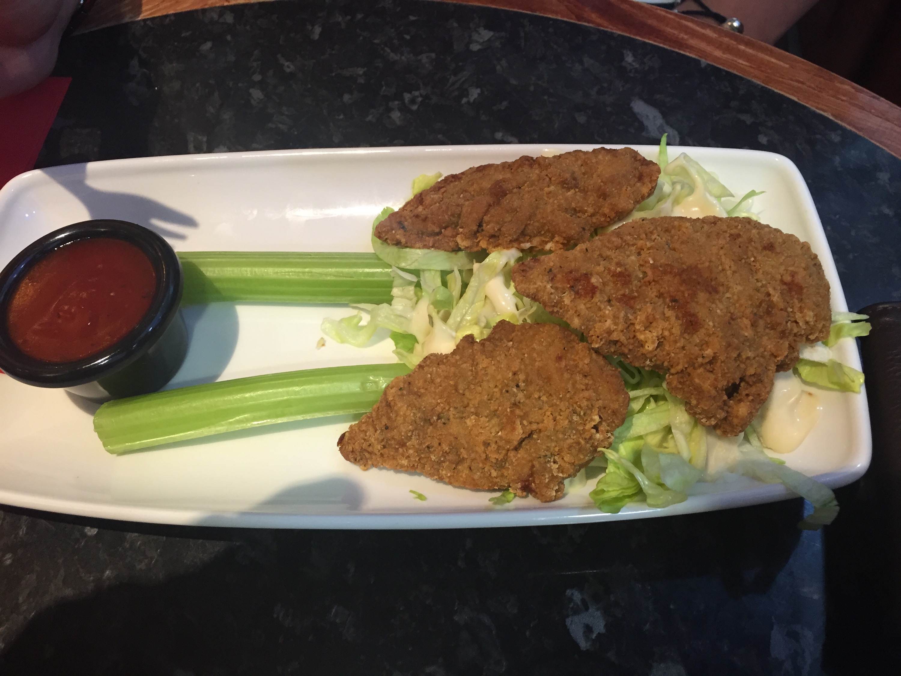 The chicken strips – you get three large bits of chicken, looks more like large chicken nuggets rather than strips. You get it with some celery sticks and a spicy tomato sauce to dip. I would rate these 4/5. I would maybe ask for a different dip next time.
