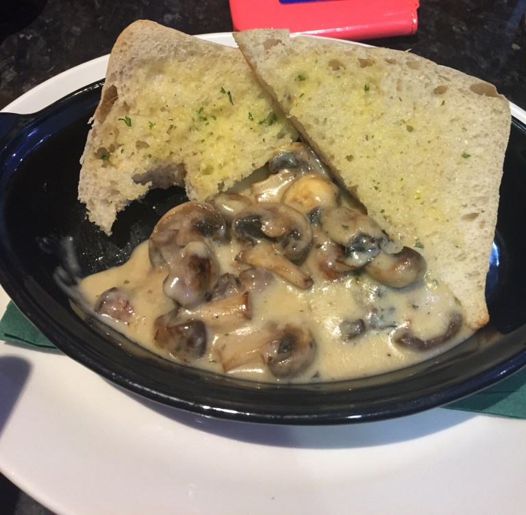Garlic cheese and mushrooms – another 5/5 for me. I would like this as a main, basically just in a bigger portion. Once agin this came with ciabatta bread. The sauce was lovely to dip the bread into. They used button mushrooms so were easy to eat and pick up, no cutting and messing around, just straight onto the fork.