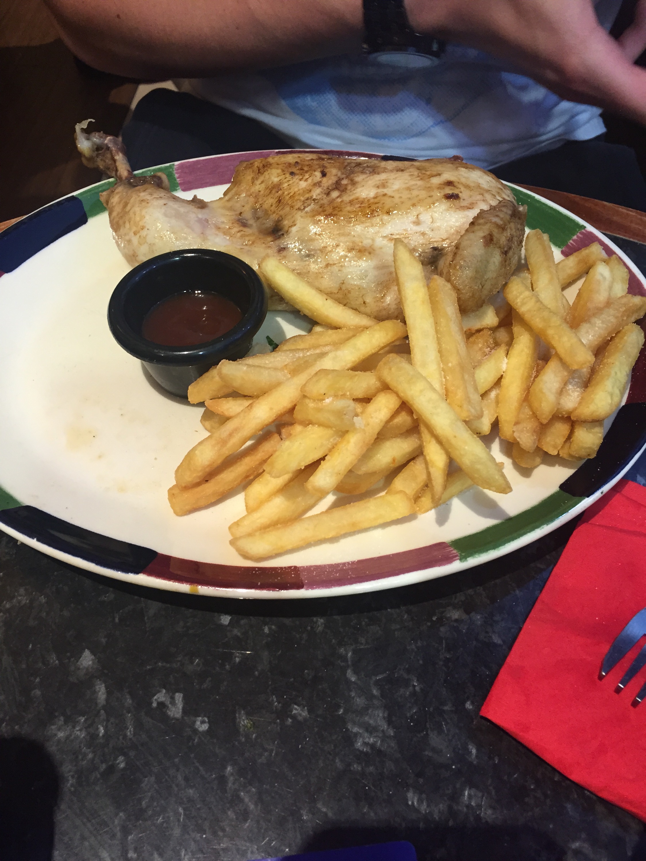 Half roast chicken – Matt didn’t enjoy this, maybe he had too much chicken from his starter. He said it was just too plain and boring. He was right, it was just plain and because of that just seemed a bit rubbery. He managed to eat all the chips and I swiped the coleslaw of his plate to eat. We would give this 3/5 just because it was too plain.