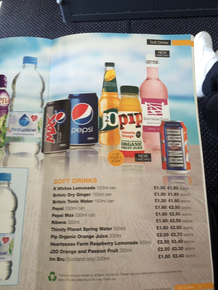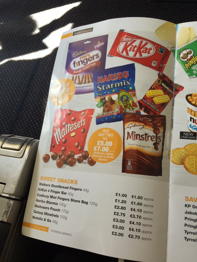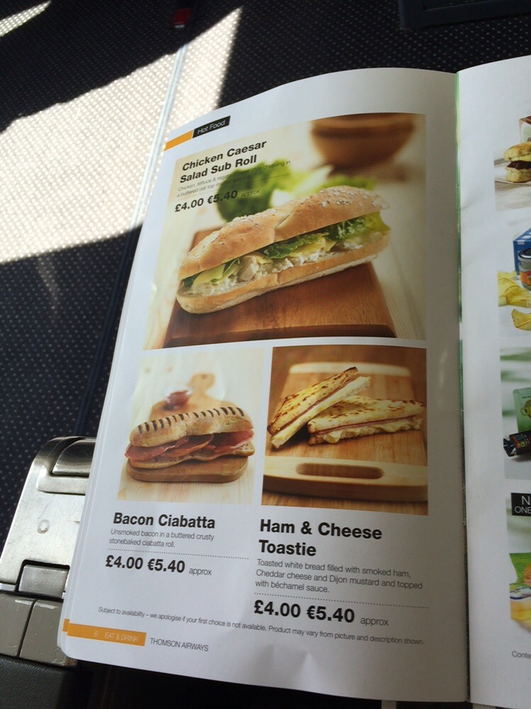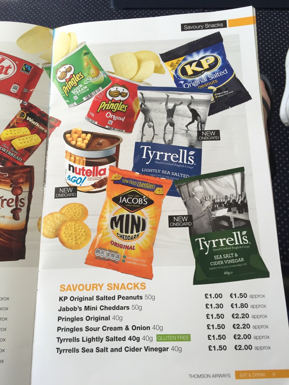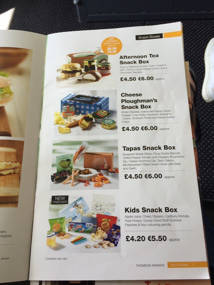 We flew with Thomson their and back. They offer a selection of cold and hot food on board. It was a short haul flight so we didn’t get a cooked meal, only the snack selection.