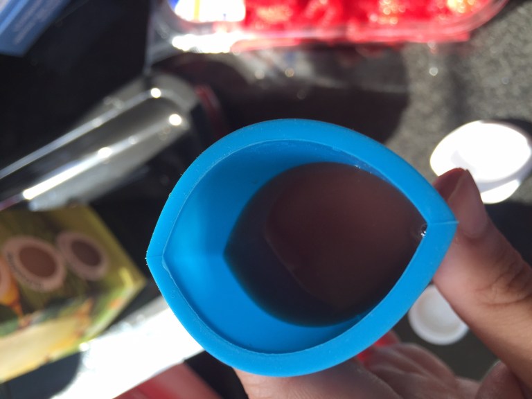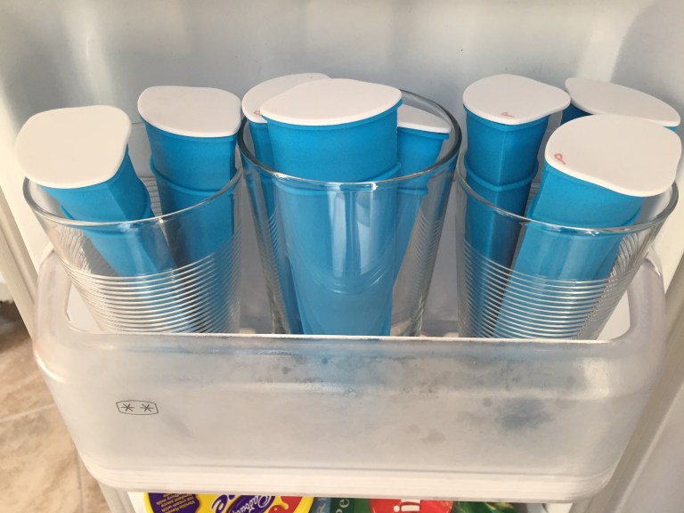 Once done keep each juice mould separate in glasses so you know which moulds contain what juice. Then add them to the freezer. Keep them in the glasses in the freezer so people can help them selves and it keeps them upright so you don’t get any spillages. Keep checking on the glasses as you don’t want them to crack and shatter. When you take them out, let the glasses cool down slowly. Once the ice lollies are set you don’t need the glasses any more. I left the ice lollies to set for about 5 hours. The more water based juice the better and faster they set. If I had more mould I could have made loads and been at it all day. I found a coconut water drink which would have been amazing frozen. Once we have eaten all these I will try that!