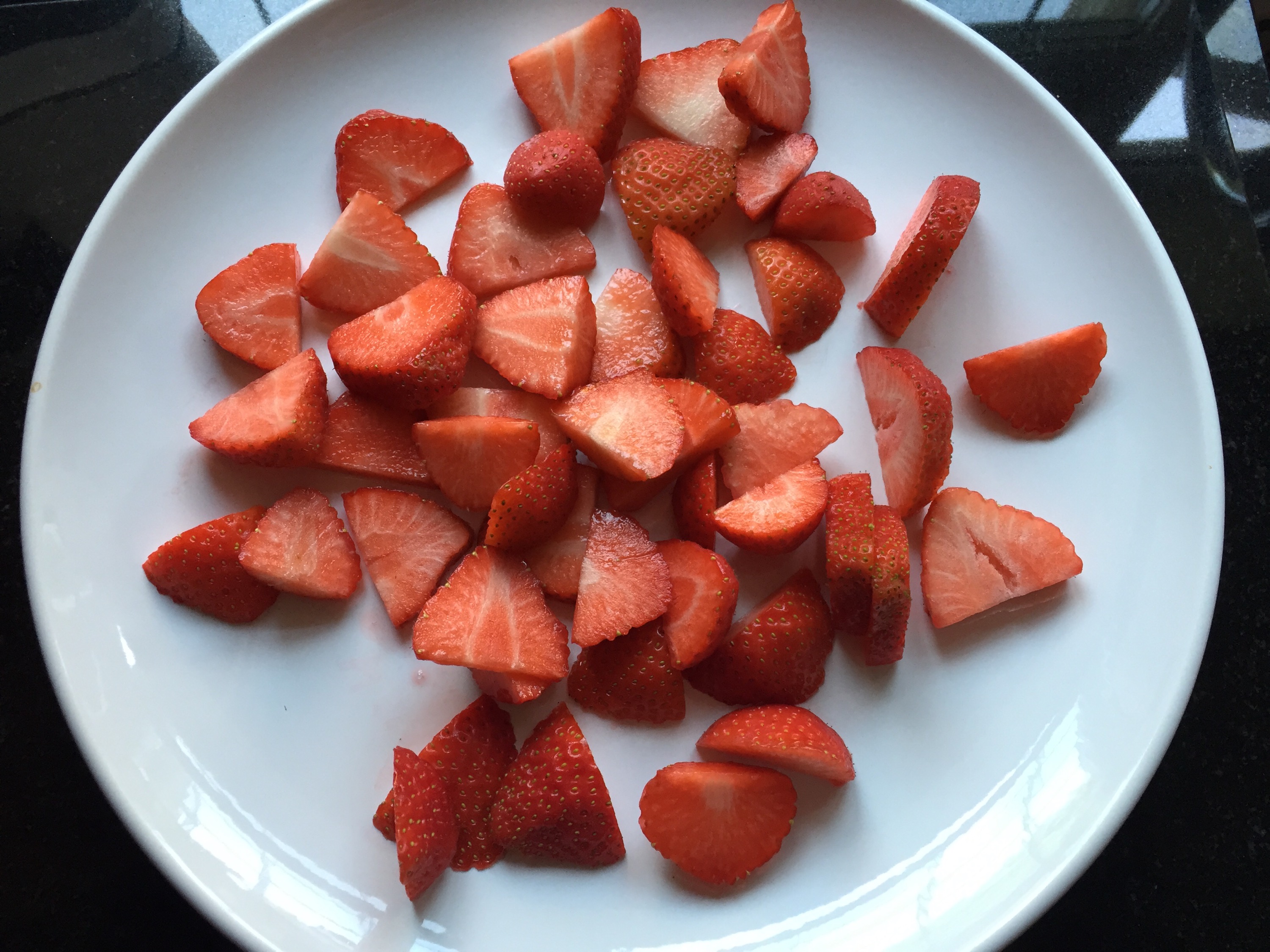 I started by cutting up the strawberries. Cut the green leaves off and then cut in half and some half again, if they were really big. I decided to do this all straight onto a plate which I was serving it on. Save in the washing up!