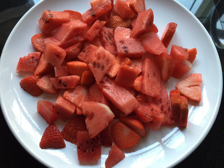 I then cut up all the watermelon. I was lucky enough my dad had started to cut down the melon. He cuts the melon into slices and then with a sharp knife, slices down the edge to free out the melon. Once he has done this he cuts it into slices. You can then grab bits out easy when ever you want it. I took about 5-6 slices and cut them up into small chunks. Added them straight to the plate of strawberries.