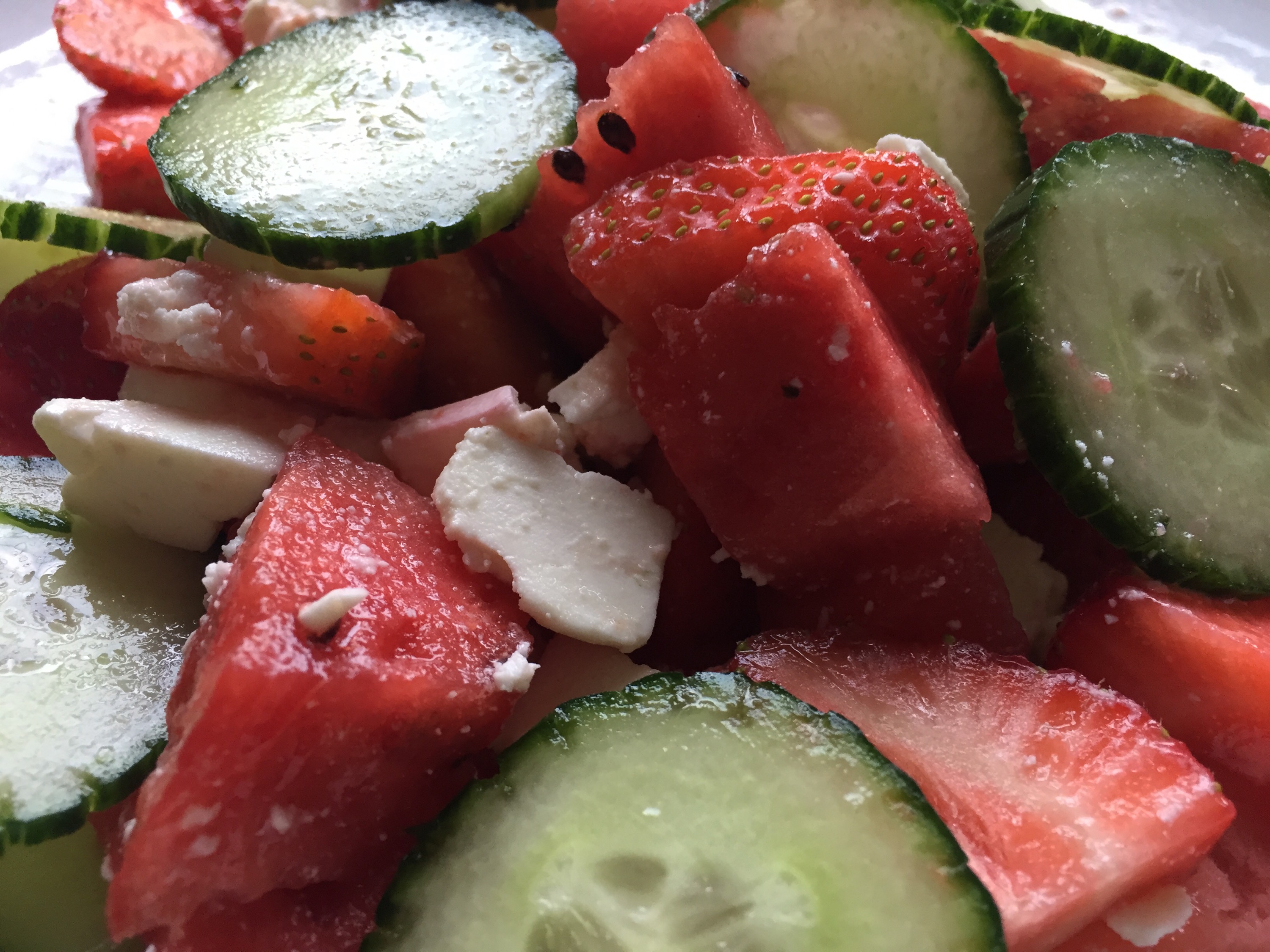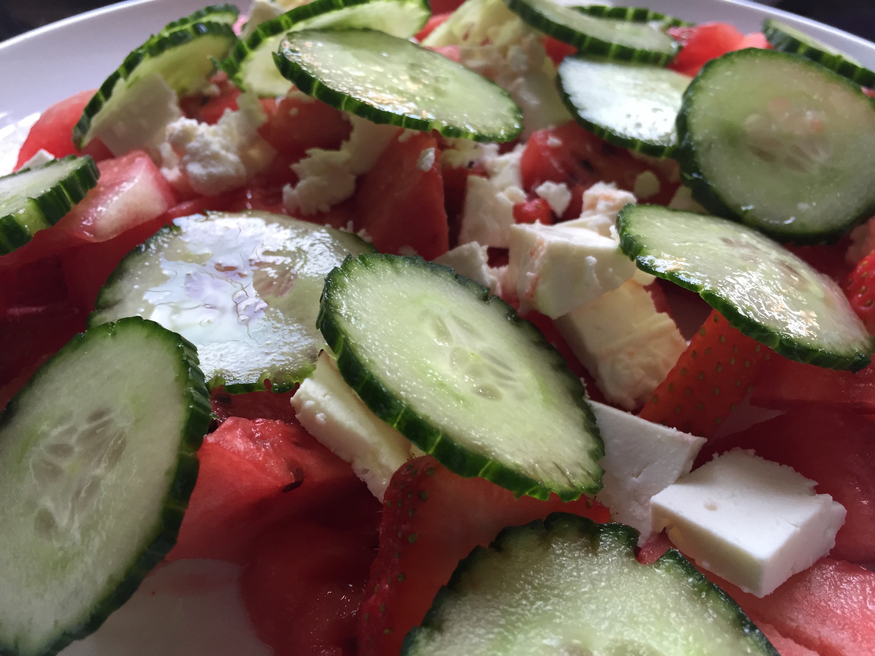 Then the cucumber. To make it look pretty, I run a fork (quite hard) vertically down the skin to make groves. Do it hard enough that it breaks the skin. I used about 1/3 of a large cucumber. Cut them into thin whole slices, and added them to the mix.