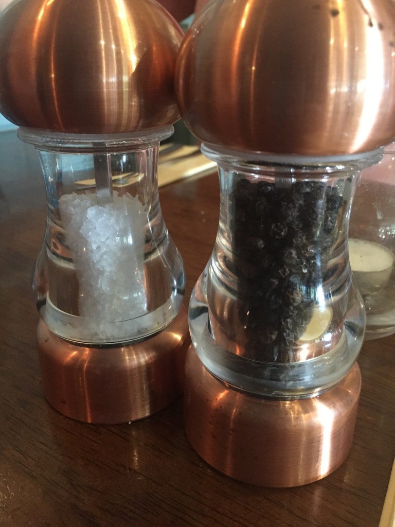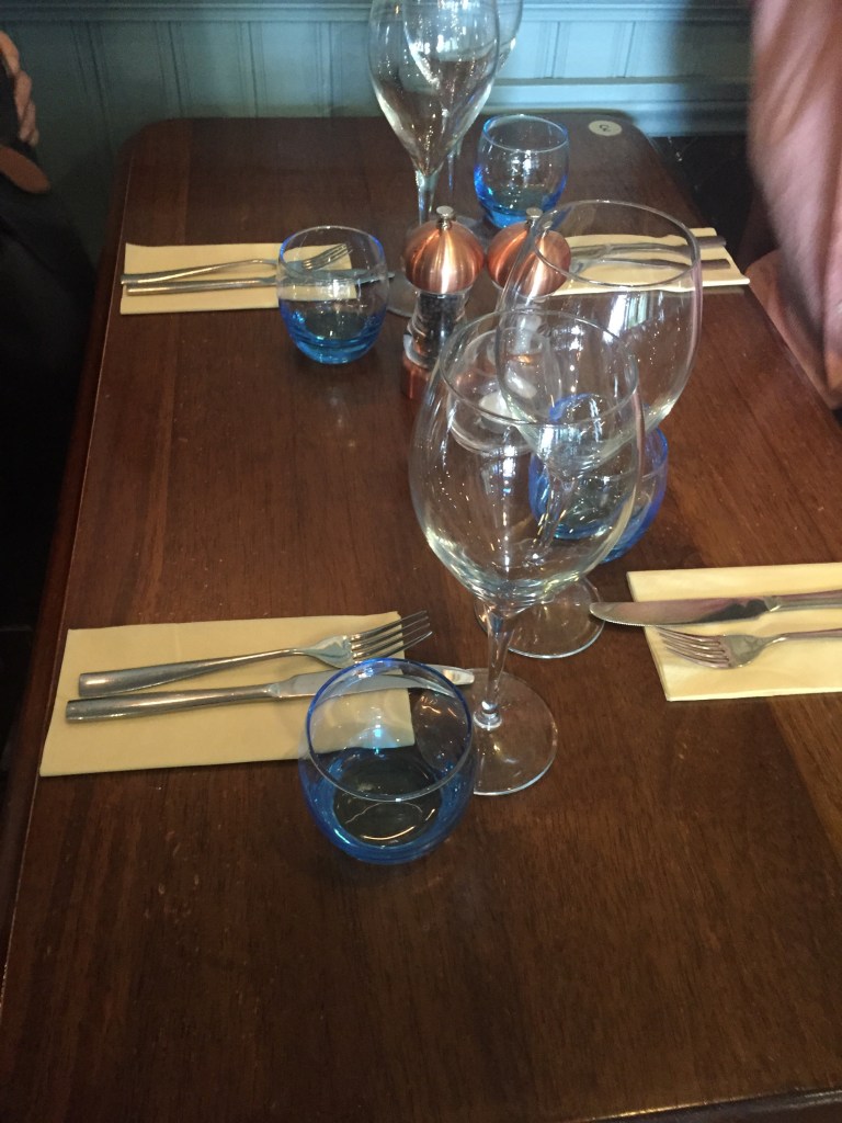 The tables are nicely set out with copper salt and pepper grinders, blue tumblers for water and huge wine glasses. They lit all the tea lights on the table too.