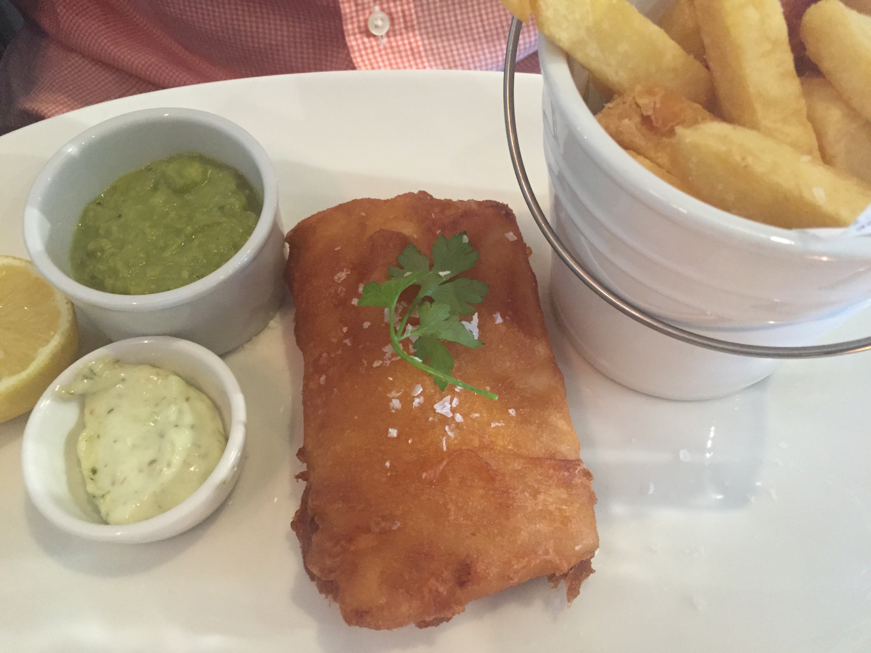 Since it was a Friday dad went for a traditional fish and chips. This was a cod fillet served with chips and mushy peas. This cost £12.95. The portion of fish was fairly small though. He gave mum the side of tartare sauce.