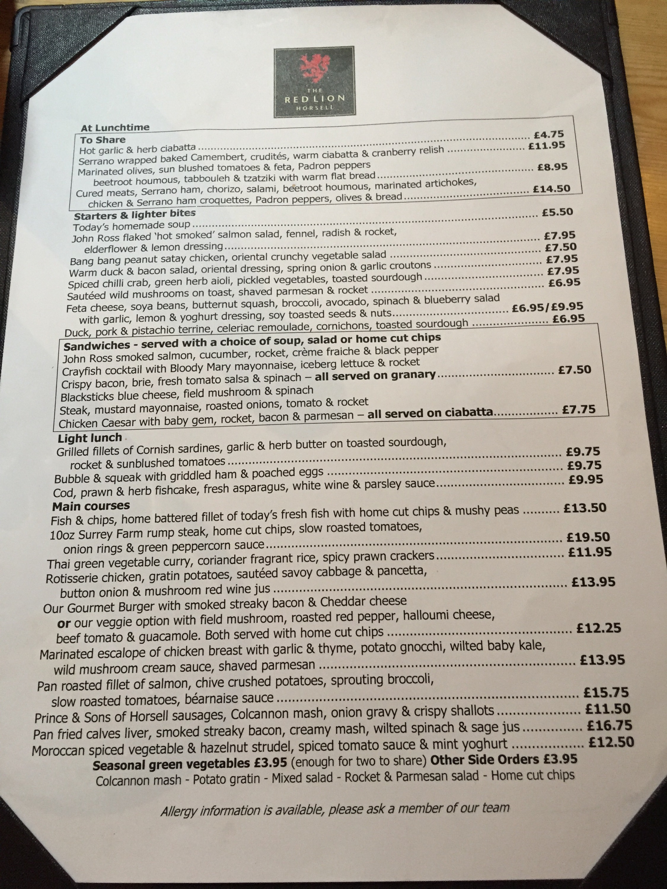 We wanted to head some where different to normal, but still local. Everyone raves about the food in the Red Lion in Horsell, so we booked a table, and we were sorted.