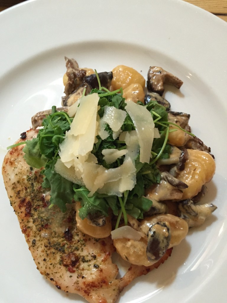 In the end I went for the chicken breast. It’s £13.95, I don’t mind paying for good quality food and this was! It’s a chicken breast with gnocchi, baby kale all in a creamy garlic mushroom sauce. It was amazing. Cafe Rouge do a similar dish, served with mash potatoe. If you love chicken and creamy sauce this will be the right thing for you! It was really good. If I was at home, eating this, I probably would have licked the plate clean.