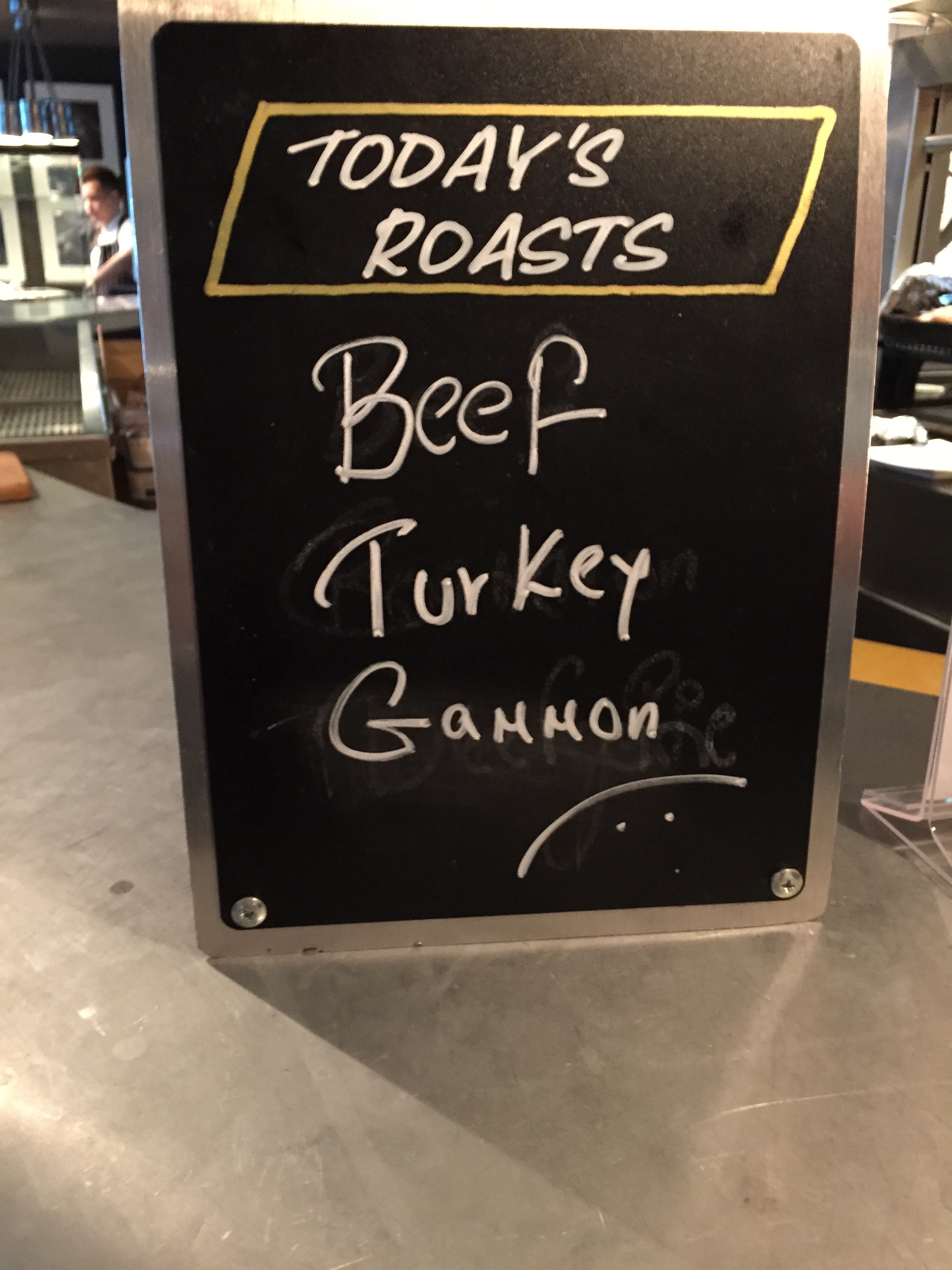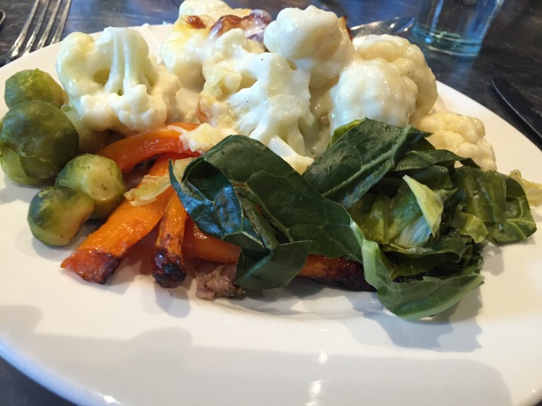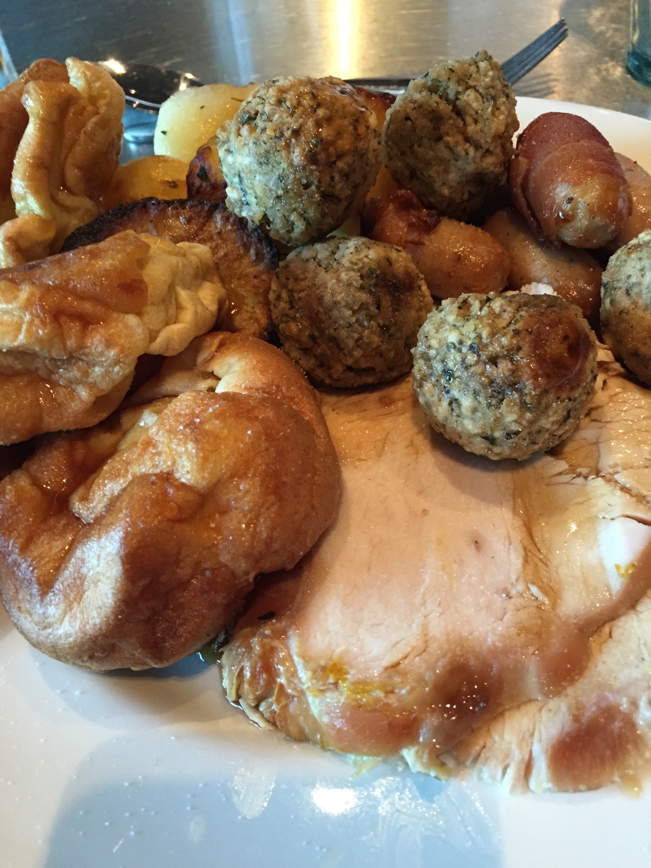 Next was the carvery. You tell the chief what meat you want. We had the choice of, Turkey, gammon or beef. I picked gammon and beef. He then slices it off and puts it on your plate. You can then help your self to the rest. They had a good selection of vegetables and potatoes. You then add the gravy. I picked up, roast potatoes, mashed potatoes, cabbage, sausages wrapped in bacon (only normally get these at Christmas), stuffing, Yorkshire pudding and some cauliflower cheese. Then covered it all in gravy.