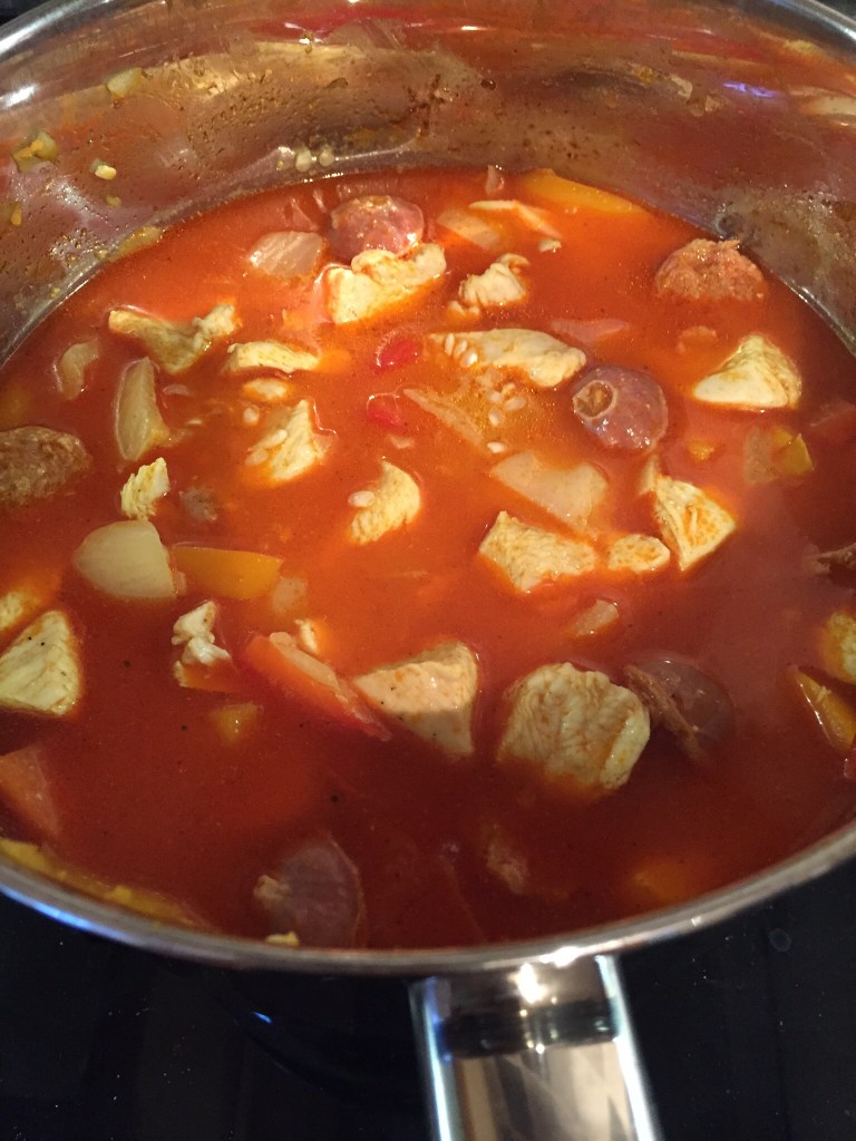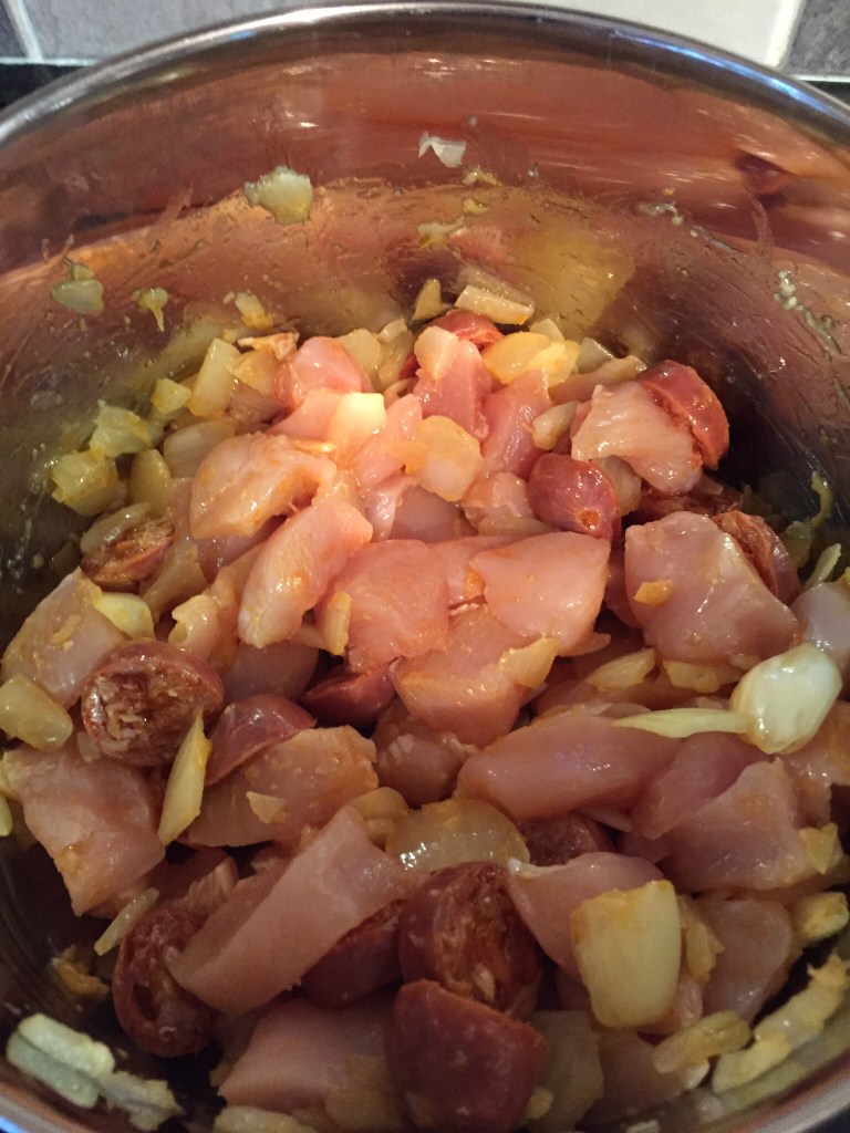 I next added the mini chorizo sausages. I cut these into slices. I left this cooking while I cut up the chicken. The smell was amazing already. The onions took the colour from the chorizo and I felt everything was going well.