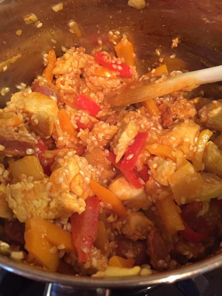 This is where I was clueless. I read the back of the paella rice box and tried to follow the directions. I added the rice to the pan so the flavours could attach to the rice before adding the liquid. I used two chicken stock cubes and boiling water. Added that to the bowl. This was now hard to is. It became really heavy and kept sticking the bottom of the pan. The rice absorb the liquid really quickly. I kept some stock back so I could keep adding liquid as I went along. I was rather sacred here that I could completely ruin the whole thing. I then added all the spices. Amanda kept sneaking in the kitchen and said it smells really good. This was a good sign.