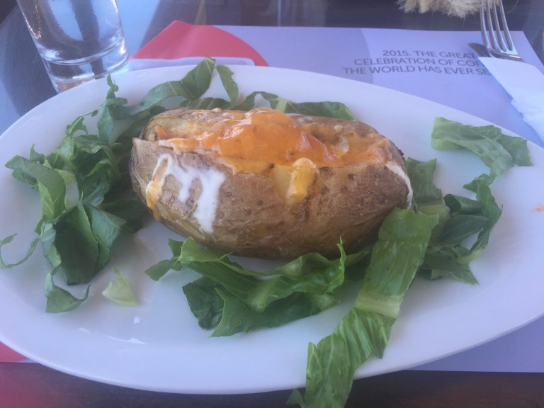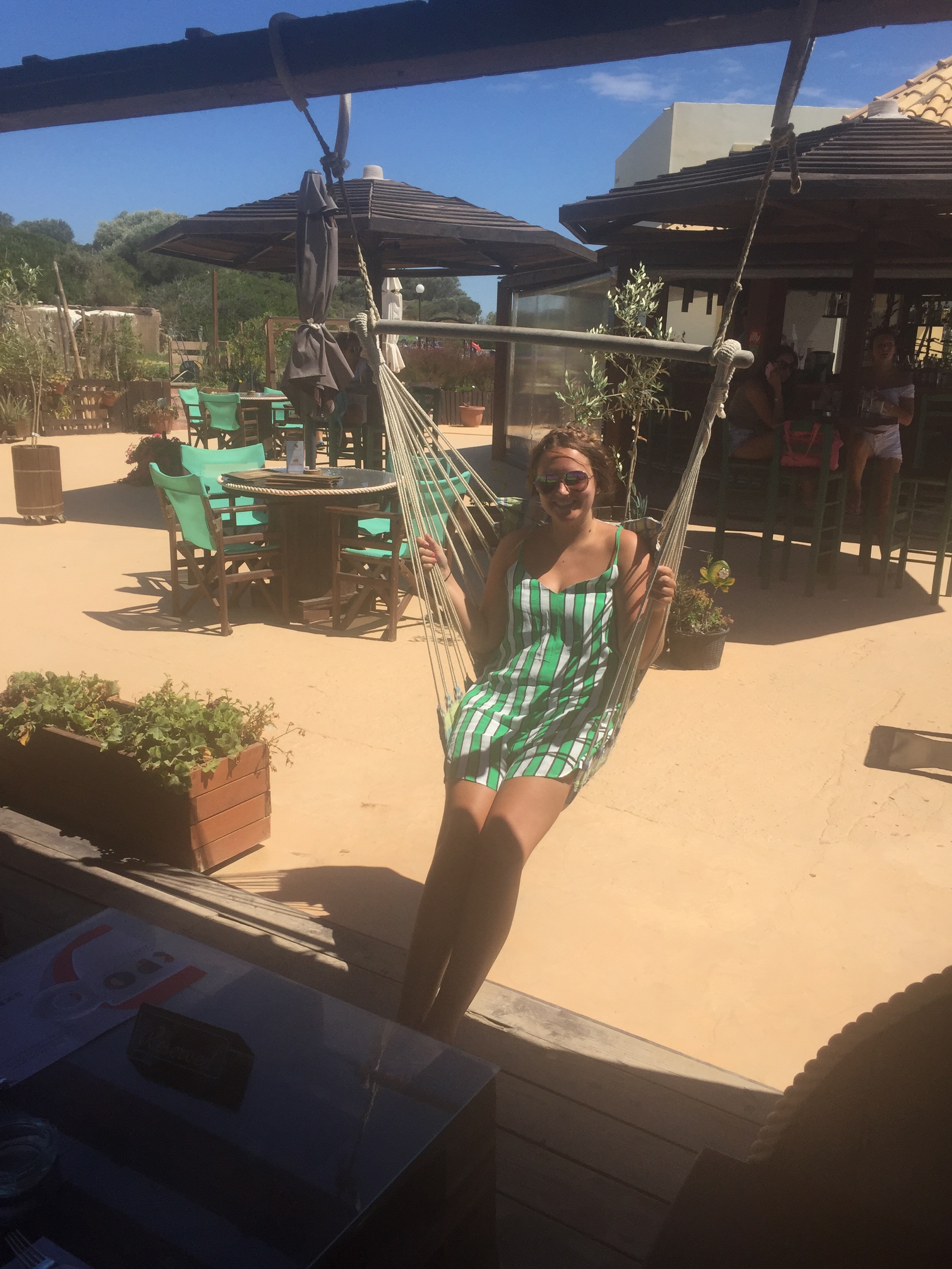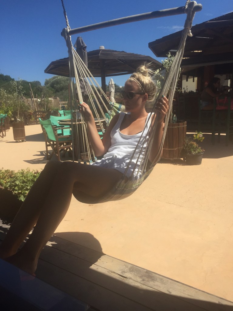 It was too windy and wavy so too dangerous to swim out to them. So we decided on lunch instead. We only wanted a little lunch as we were going to go to the Chinese early before Lauren started work. I went for a jacket potatoe with cheese, bacon and sour cream. It was yummy! We decided to share some nachos topped with cheese and chicken too. They have a swing which we all posed on. It is actually pretty comfy. It’s quite relaxing swinging on it, looking out to sea.