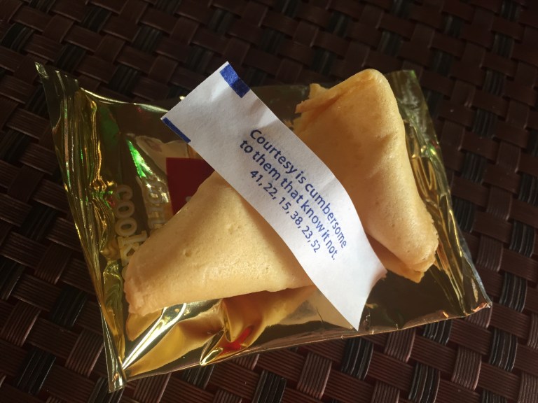 We then paid and got our future cookies. Mine read “courtesy is cumbersome to them that know it not” I didn’t have a clue what this meant.