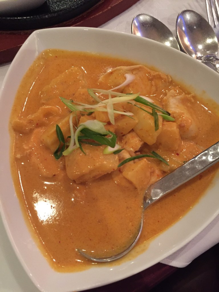 For the mains I went for another chicken dish. It’s called Massamun Kai. It was £10.80. It’s a chicken curry with peanuts, pineapple and potatoes. It looks like a chicken korma, but has the fresh fruitiness of a chicken tikka masala. This was really good. It’s not spicy either which is good. You can ask how spicy you want your dish here too. I would request a low spice even if they don’t ask, just in case. I would give this dish 10/10. It was lovely. I thought about asking for no pineapple, but I am glad I didn’t. I think the potatoes fills you up and the pineapple adds a zing to it. It was really good.
