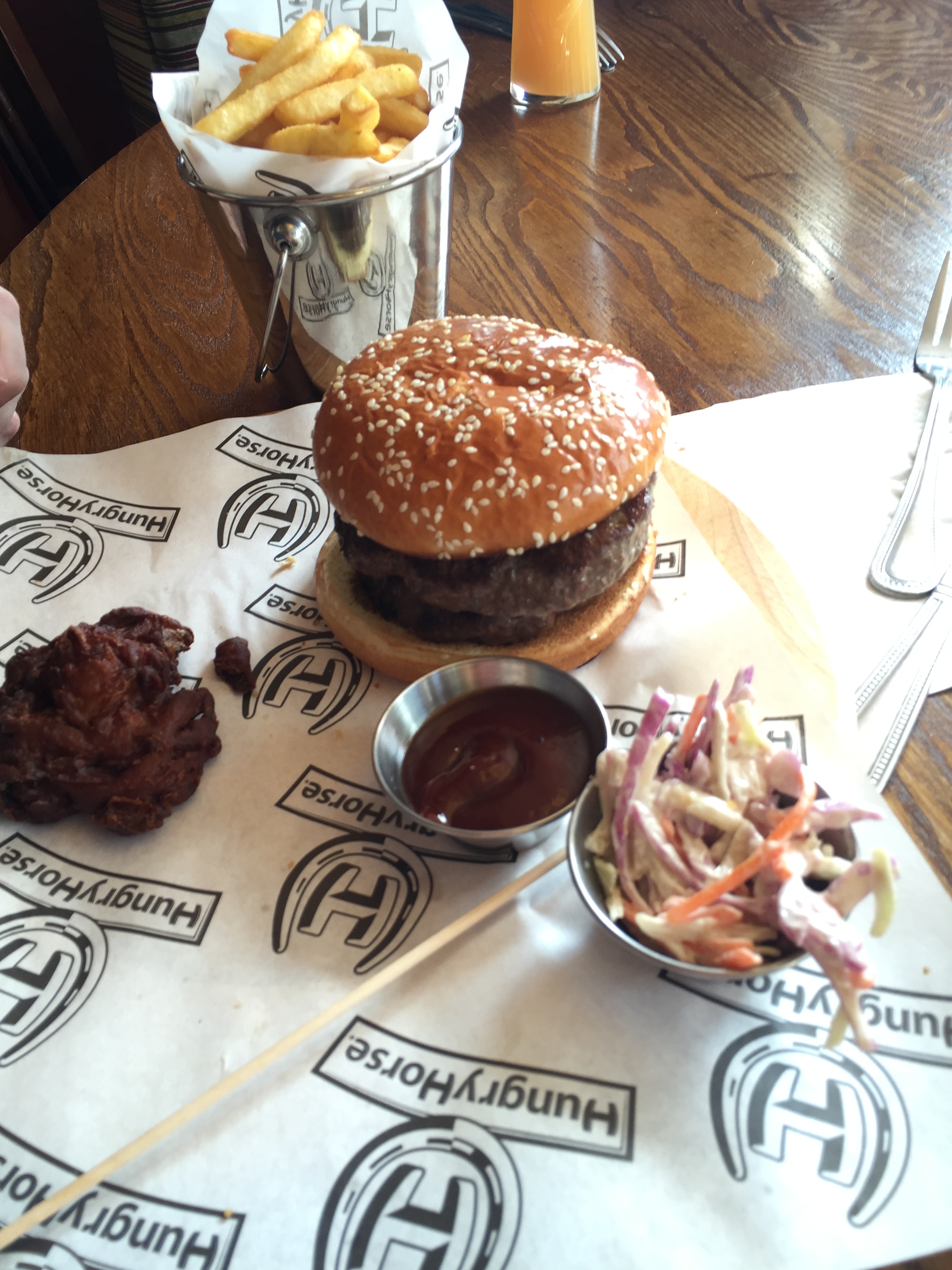 Dad went for a burger. This was £4.99. He went for a double burger. The single burger is £3.99. This comes served on a board with a bowl of coleslaw (which mum stole) and a bucket of chips.