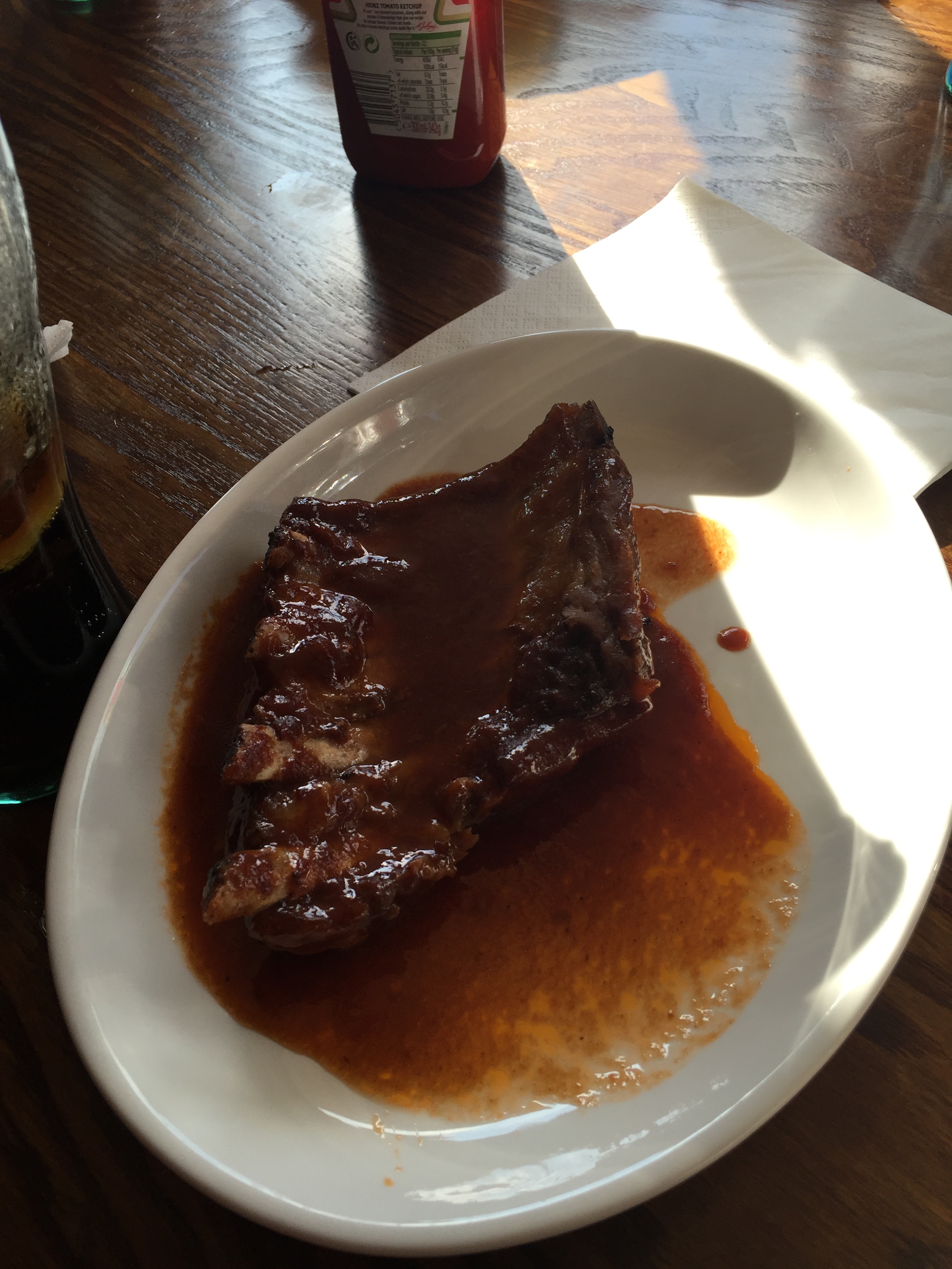 Mum went for Macaroni Cheese. This was £4.49. It comes in a big dish served with a few slices of garlic ciabatta bread and a side salad. She also got a side of ribs to go with it. These were £3.49 for half a rack of rips smothered in BBQ sauce.