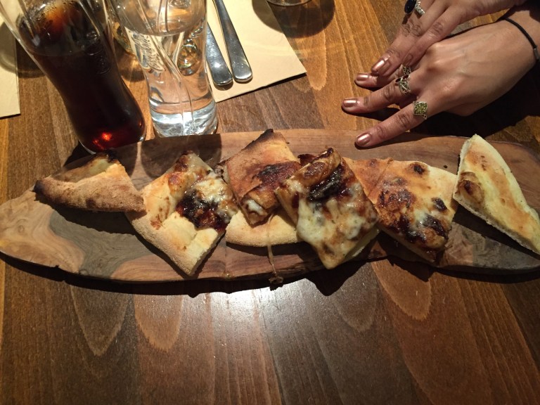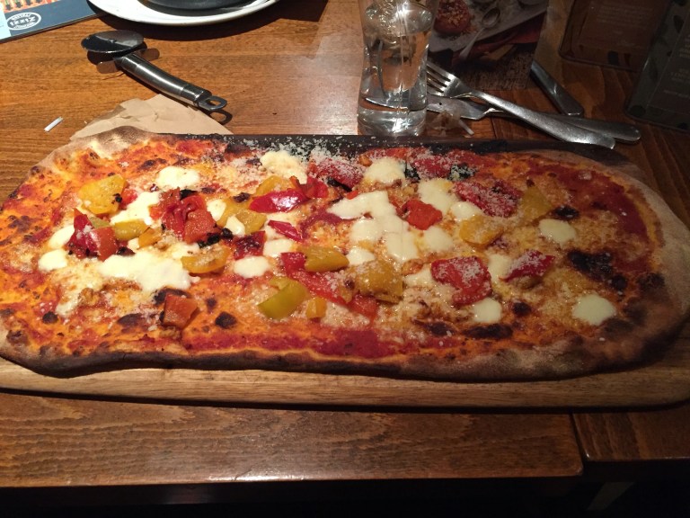 Nadeem went for a pizza. He did a create your own type. He had a rustic base which means it’s stretched out further than a normal base, so more crispy. He got a classic margherita and added roasted peppers to the top. This looked good.