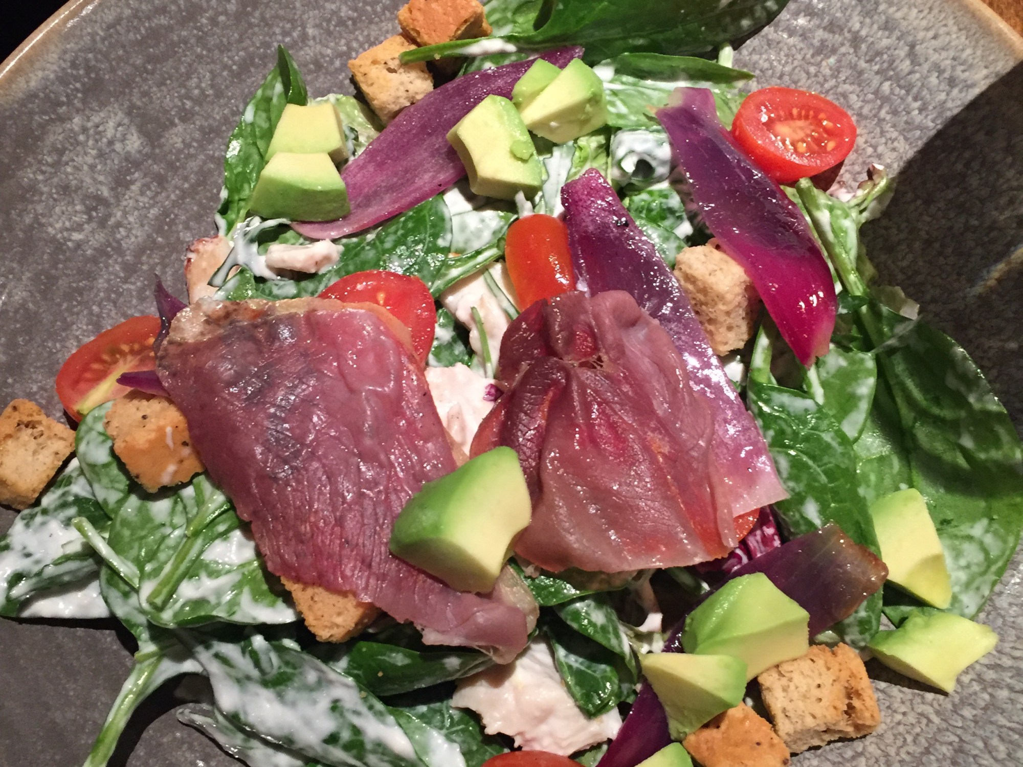 Kirch and Becca went for a salad for their main, it was called chicken and prosciutto salad. This looked really tasty when they bought it out. You get chicken, prosciutto, avocados, onion, tomatoe, croutons, spinach, rocket and then dressed with an alioli sauce. They both really liked this dish, they did say that the prosciutto was really tough and salty so they found it hard/impossible to eat it.